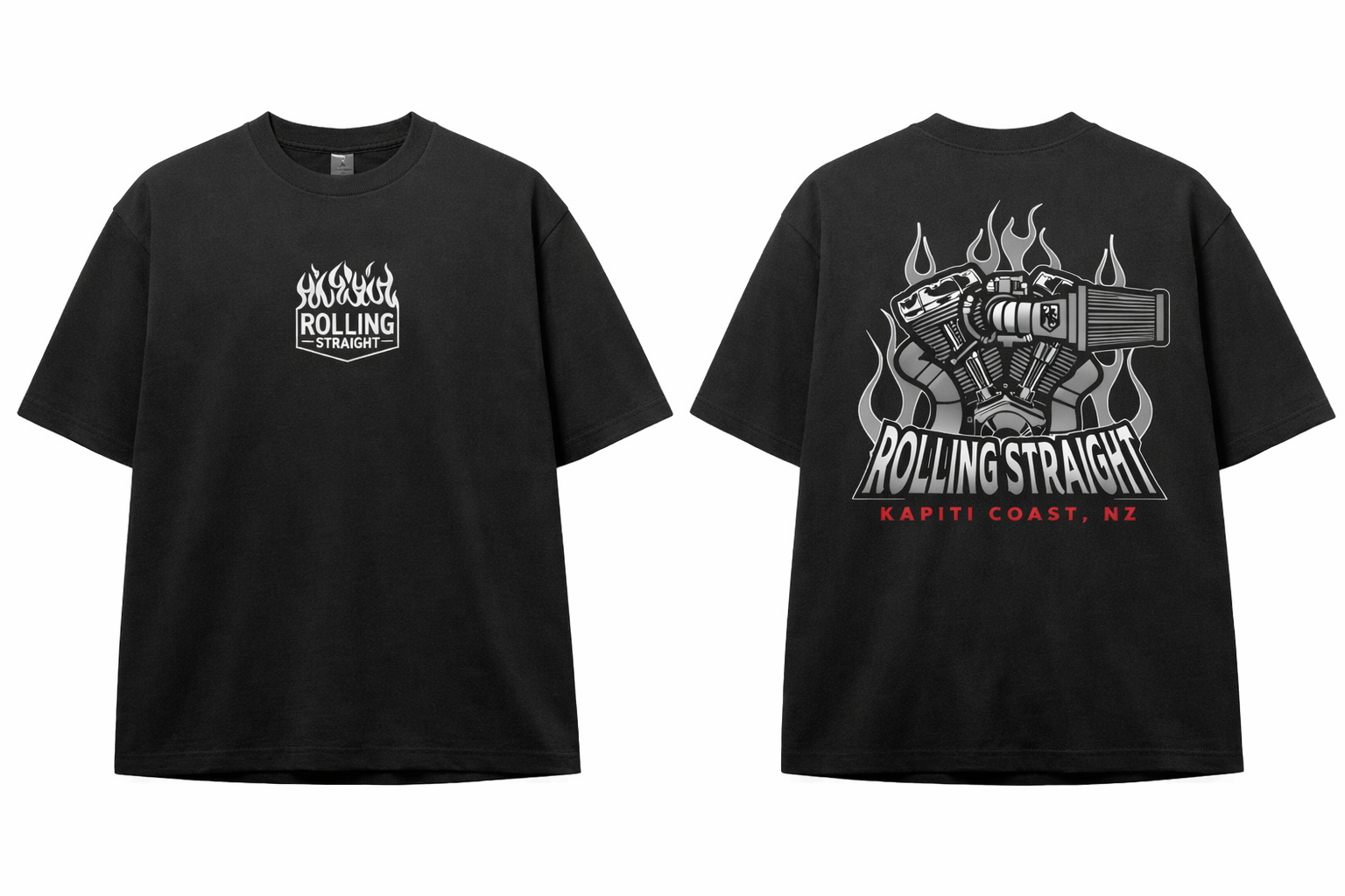 The Rolling Straight Flame Tee features our signature flame logo centred on the chest and the full V-twin back print stamped loud across the shoulders. Designed for the workshop, the ride, or the weekend.